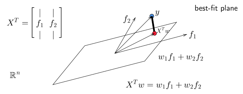 From a geometric viewpoint, \(\mathbf{X}^T \mathbf{w}\) represents a linear combination of feature vectors. The projection of \(\mathbf{y}\) onto the plane spanned by the columns of \(\mathbf{X}^T\) gives the best approximation.