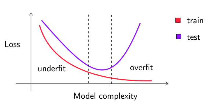 A balance between model complexity and generalization is essential. If training loss is low but test loss is high, the model overfits. If both losses are high, the model underfits. The relationship is illustrated below: