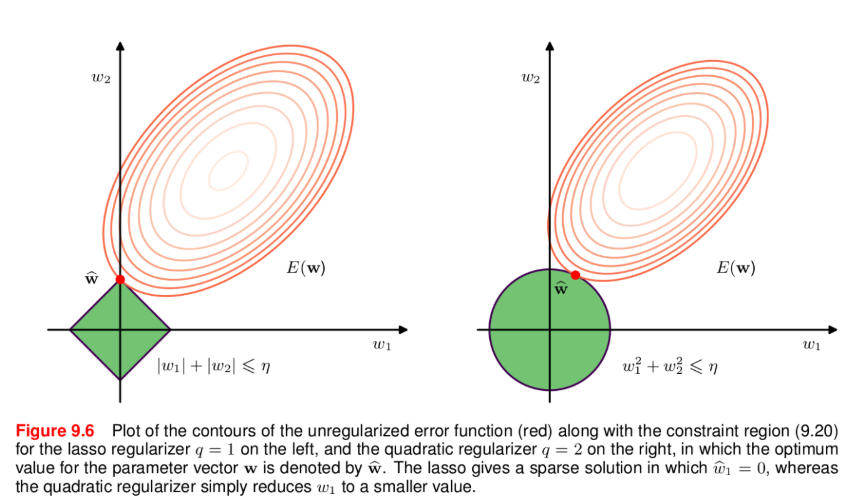 The constraint forces weight values to remain within a bounded region. Lasso imposes an \(L_1\) constraint, which often results in sparse solutions.