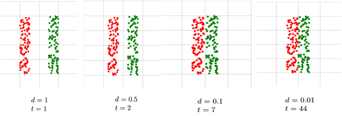 - Smaller margin increases the number of updates, meaning that perceptron requires more iterations to converge.