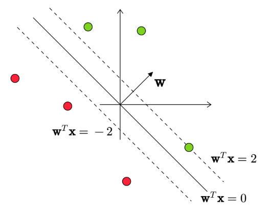 In this course, we follow the convention that \(\mathbf{w}^{T}\mathbf{x} = 0\) is predicted as 1.